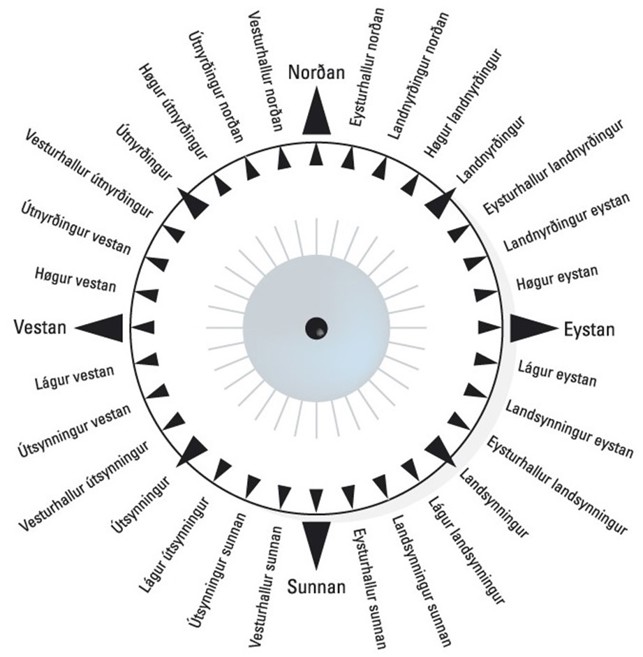 Mynd 3: Tær 32 ættirnar. Til samrøðuna eru ikki allar 32 ættirnar brúktar, men onnurhvør - t.e. heil-, hálv- og millumættirnar.