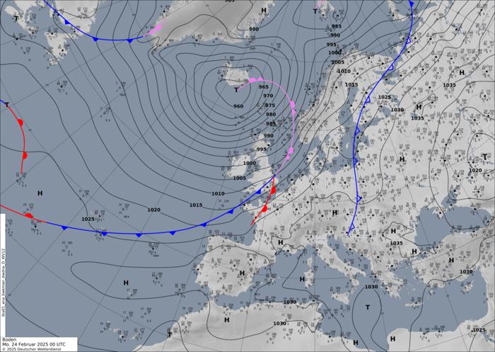Mynd av veðurkorti frá týsku veðurtænastuni Deutsche Wetterdienst 24. februar 2025. Lágtrýst liggur tætt við Føroyar og hevur við sær vind av útsynningi og nakað av regni úr brúgvalagi haðani.
