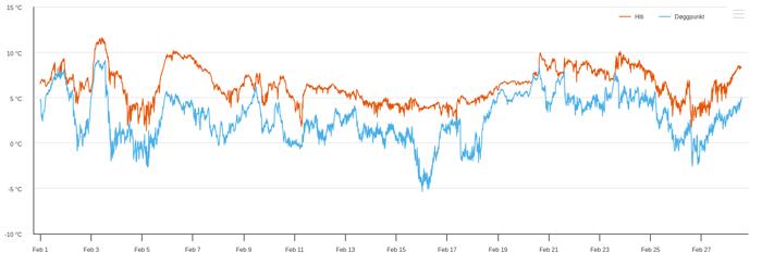 Lágættin í februar 2025 sæst eisini í hitamátingunum, har ið miðalhitin í løtuni liggur um 6,31 stig. Hitalagið hevur verið lutfaldsliga støðugt. Mesti hiti var 11,3 stig; minsti hiti 1,3 stig. Kelda: Veðurstova Føroya.