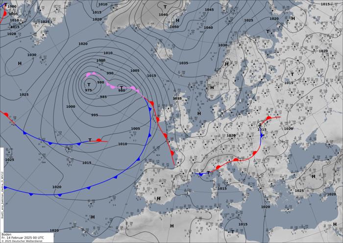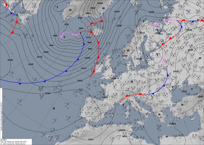 Mynd av veðurkorti frá týsku veðurtænastuni Deutsche Wetterdienst 1. februar 2025. Á kortinum sæst eitt hátrýst, 1030 hPa, yvir meginlandinum, ímeðan eitt lágtrýst, 965 hPa, í útsynningi úr Íslandi við einari hitabrúgv tætt við Føroyar.