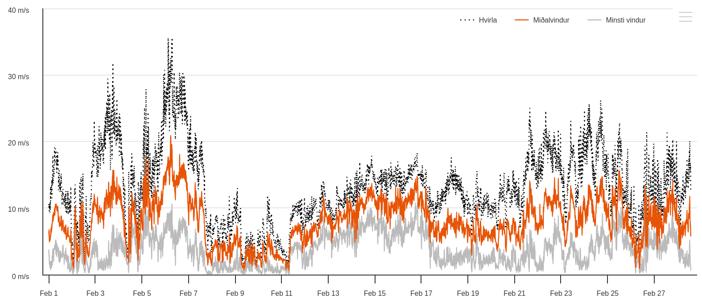 Vindmáting í Havn í februar í ár Miðalvindurin hevur ligið um 8 m/s. 6. og 7. februar var illveður. Tá kom miðalvindurin á Hoyvíksvegnum upp á 21 m/s, ímeðan harðasta hvirlan var máld til at vera 35,6 m/s. Kelda: Veðurstova Føroya