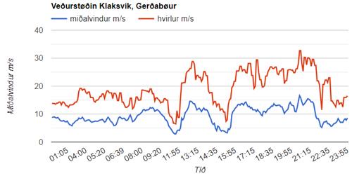 Miðalvindur og hvirlur í Klaksvík, Gerðabøur, tann 19.08.2023. Mesti miðavindur var 16.6 m/s kl. 20:30 og ringasta hvirla var 32.6 m/s kl. 20.35. Kl. 21.45 minkaði vindurin og kl. 22.45 vóru hvirlurnar umleið 15 m/s. Frá www.lv.fo