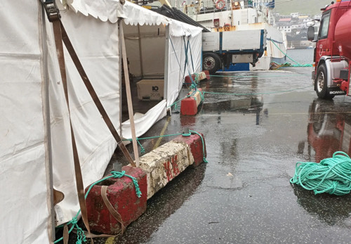 Mynd frá sunnumorgun 20.08.2023. Hóast nógvur vindur og harðar hvirlur var tíbetur eingin skaði. Stóra teltið bognaði eitt sindur og stóru betongklossarnir uppá 530 kg hvør fluttu seg eitt sindur.