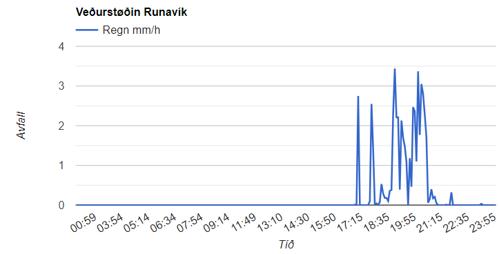 Tíverri eru ongar mátingar av avfalli í Klaksvík, men tað byrjaði so smátt at regna uml. kl. 17, so sleit í eina løtu og so regnaði illa frá umleið kl. 18.30 – akkurát tá síðsta kappingin, togtogan var av. Tað var grimdarregn í 3-4 tímar, so fólk vórðu vát uppá stutta tíð, um tey ikki vóru í oljuklæðum. Hóast ringa veðrið var køin enn long til “Fisk&Kips frá JFK”, har fólk stóðu í 3-4 tímar í góðum hýri! Tað eru mátingar av avfalli aðrastaðni, niðanfyri sæst t.d. Runavík. Mett verður, at tað regnaði væl meira í Klaksvík – ja, næstan “skybrud” ella glopraregn, sum DMI hevur sett til 15 mm uppá 30 min. Nei, so ringt var tað ivaleyst ikki, hóast alt. Um onkur hevur regnmátingar frá degnum eru vit fegin at hoyra um tað, vedur@vedur.fo.