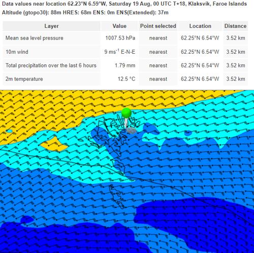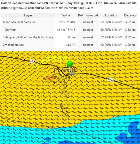 Modell-forsagnir frá ECMWF av trýsti, vindi, hita og avfalli frá 19.08.2023 kl. 01 vísa at tað er turt kl. 13, kl. 16 er avfallið sunnanfyri Føroyar, kl. 19 regnar tað í Klaksvík. ECMWF-vindurin í Klaksvík er umleið 9-10 m/s eystan og mesti modell-hitin var 14.2 stig.