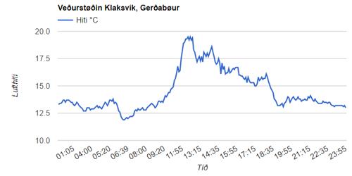 Hitin í Klaksvík, Gerðabøur, tann 19.08.2023. Frá 12:20 til umleið 12:40 lá hitin á umleið 19.5 stig. Í Klaksvíksgarðinum hevði onkur mátað 22-23 stig. Frá www.lv.fo