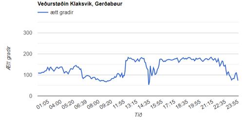 Miðal vindætt í Klaksvík, Gerðabøur, tann 19.08.2023. Tá mesti vindur og ringastu hvirlur vóru var ættini umleið 170 stig – eitt sindur eystan fyri sunnan. Seint um kvøldið fór vindurin í umleið eystan, 90 stig. Frá www.lv.fo
