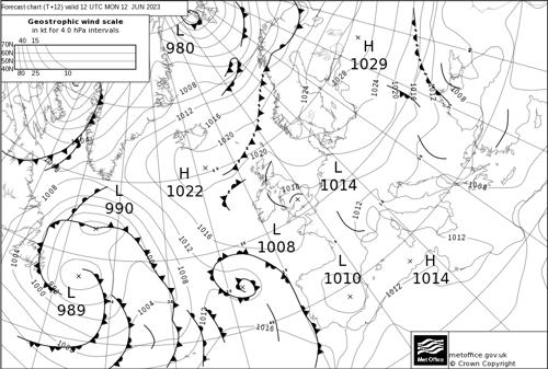 Forsøgnin fyri middag í dag, mánadagin 12. juni. Miðjan á hátrýstinum er í útsynningi vestan úr Føroyum. Tí er ættin kring landið um vestan. Vestan fyri Skotland, men rundan um sama hátrýst, er ættin landsynningur