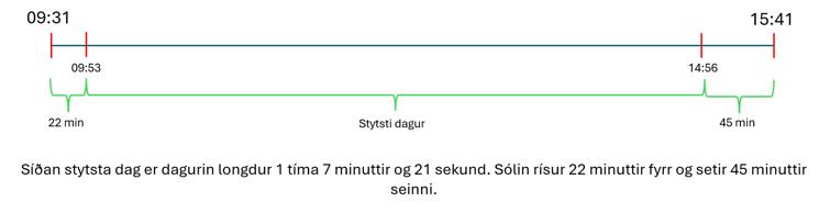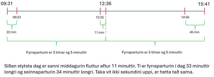 Sólin var hægst á himli stytsta dag klokkan 12:25 og klokkan 12:36 í dag. Sannur middagur er fluttur 11 minuttir aftur. Líka sum fyrraparturin er roknaður frá sólarrisi til middags, skulu hesir 11 minuttirnir leggjast afturat fyrrapartinum og dragast frá seinnapartinum – sí tekning niðanfyri.