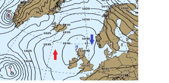 Luftin melur rundan um eitt hátrýst við klokkuni, og hyggja vit eftir myndini, so síggja vit, at vestan fyri miðjuna á hátrýstinum rekur lýggj luft sunnaneftir (tann reyði pílurin), meðan køld luft rekur norðaneftir eystan fyri miðjuna (tann blái pílurin). Tí kalla veðurfrøðingar hetta fyri ta heitu síðuna og ta køldu síðuna á hátrýstinum, ávikavist.