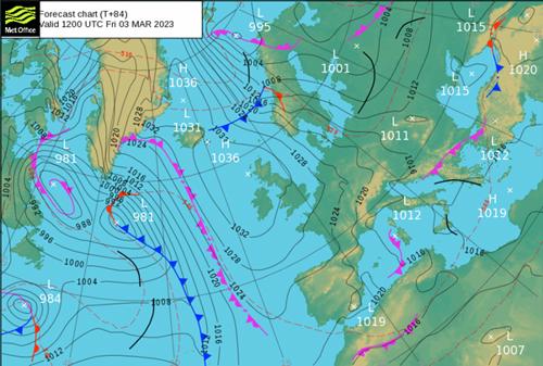 Kortið vísur eitt boð uppá hvussu veðrið fer at vera fríggjadagin. Køld luft sást koma norðaneftir. Aðrar forsagnir meta, at kuldin ikki kemur fyrr enn í vikuskiftinum.