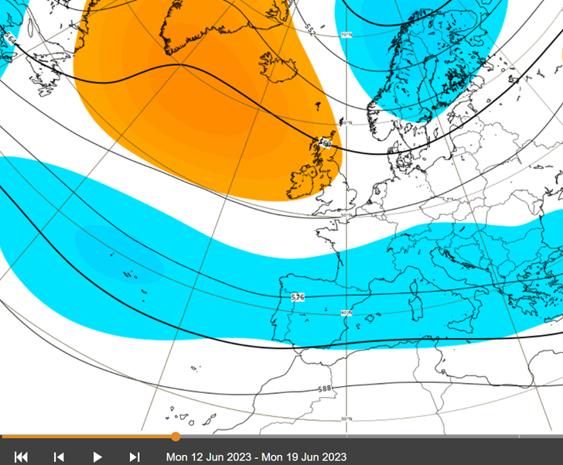 ECMWF: Frávik í lufttrýstinum í 500hPa/uml. 5,5 km fram til 19. juni. Reyðguli liturin vísur, hvar lufttrýstið er størri enn vanligt. Tann blái liturin vísur, hvar lufttrýsið er minni enn vanlígt.