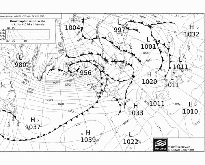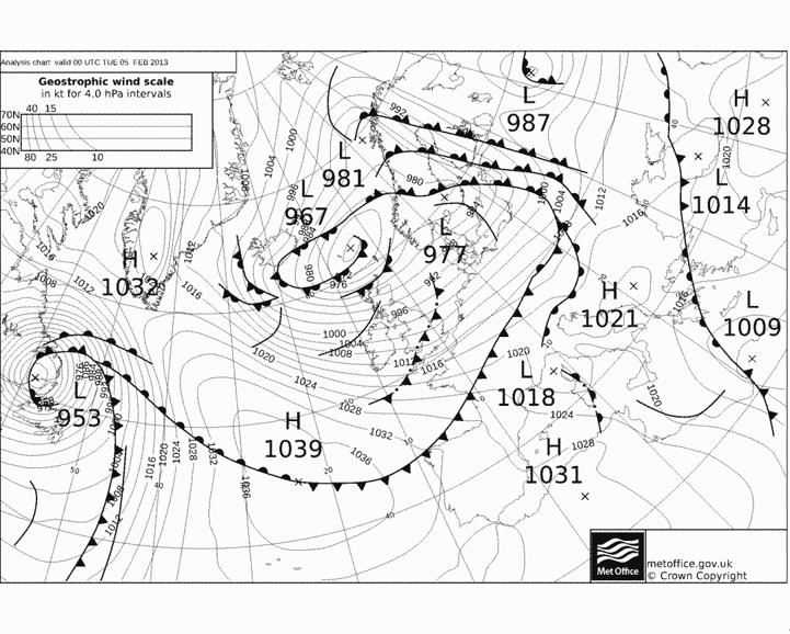 Ovara kortið er frá 4. februar klokkan 00 – t.e. 16 tímar áðrenn myndirnar vórðu tiknar. Niðara kortið er frá 5. februar klokkan 00, 8 tímar eftir myndatøkuna. Eitt lágtrýst, 956 hPa, er sunnan fyri Ísland á fyrra kortinum, men hevur flutt seg eystur um Føroyar á seinna kortinum, meðan tað er grynt til 967 hPa.
