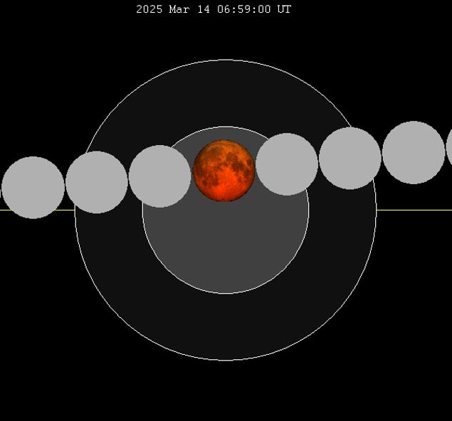Full mánamyrking ella blóðmáni sæst í Føroyum um morgunin 14. mars 2025, um kl. 06:30. Fulla mánamyrkingin byrjar kl. 06:19 og er hægst kl. 06:52. Mánin stendur nær havsbrúnni í vestri, og sæst tí helst best nakað áðrenn og av einum stað har ein sær havsbrúnna í vestri.