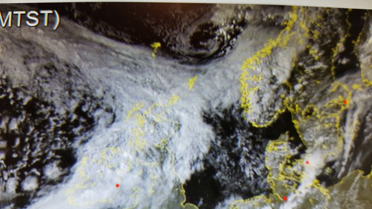 Úr fylgisveini sá tað soleiðis út um okkara leiðir hetta sama kvøldið. Norðan fyri Føroyar er klárt ella smáskýggjað, og skýlagið er komið norður til Suðuroyar.