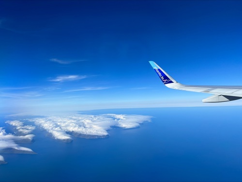 Mynd tikin úr flogfari 17. august. Púra klárt er í erva eystanfyri. Norðan fyri Føroyar eru nøkur kløn høgtliggjandi lagskýggj