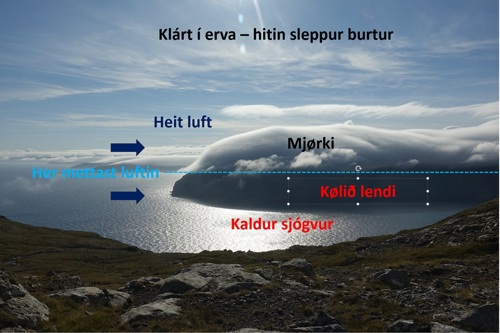 Ættin hendan dagin var næstan beint inn á Borðoyanes. Vindfeðrin var 3 til 4 m/s, hitin í luftini lá um 11 stig, og vætuinnihaldið millum 85% og 90%. So er ikki nógv sum skal til, fyri at fáa vætuna úr luftini. Tá ið luftin, sum rakti Borðoyanes, varð tvungin uppeftir, er hon kølnað umleið 2 stig, tá ið hon var komin upp, har sum niðasti kanturin á fjallaskýnum sæst á myndini. Vætuinnihaldið var tá komið upp í 100%, og so gjørdist dampurin í luftini til elaltílar vatndropar, sum løgdu seg sum ein trongd húgva niður á fjallið.