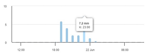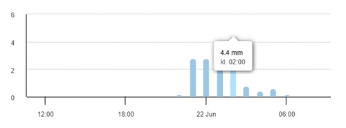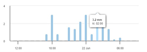Her sæst, at í Tórshavn regnaði tað ímillum kl. 19 og kl. 01 um náttina. Men tað kom mest niður ímillum kl 22 og 23, nevniliga 7,2 mm. Mátingarnar á Eiði vísa, at regnið vardi longri norðanfyri. Men hinvegin regnaði tað minni intensivt, í mesta lagi 3,2 mm eftir einum tíma. Tað byrjaði at regna eitt sindur seinni í Fugloy, eitt sindur eftir midnátt, men regnið vardi alla náttina, tó í minni mongdum, sum leið á náttina.