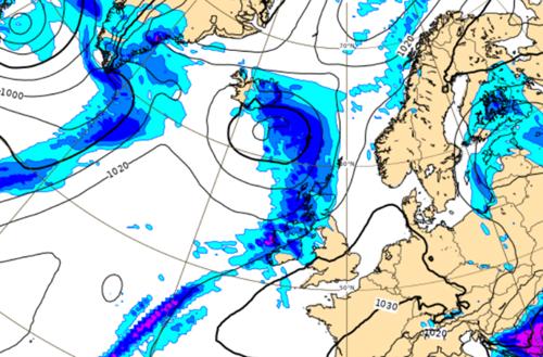 Eitt stórt lágtrýstøki yvir Norðuratlantshav fer at ganga í landnyrðing ímóti Íslandi og fer at troka hátrýstið yvir Føroyar í landnyrðing og burtur frá Føroyum.